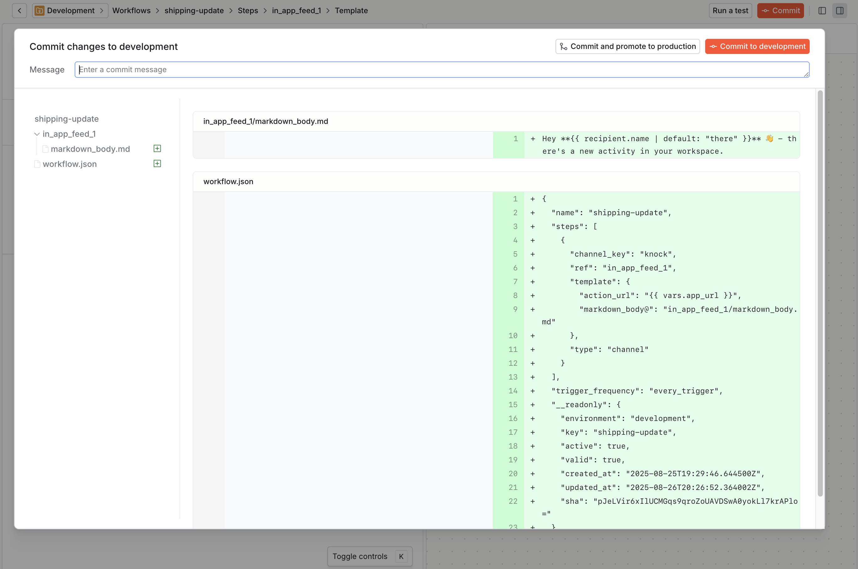 Knock uses logically separated environments to control the roll-out of your notifications. When you're happy with the way your workflows work and look, you just need to promote them to production to start sending notifications to your real users.